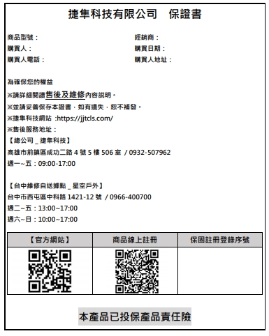 2.保固範圍為全機保固(不含人為因素所造成的損傷)