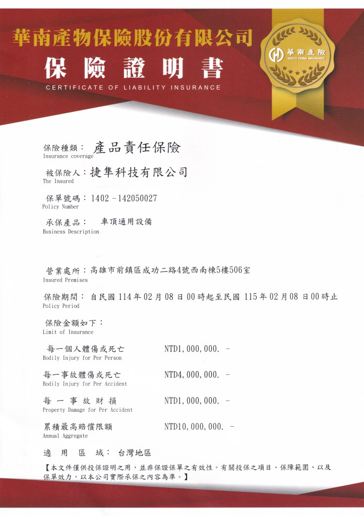產險投保證明書-車頂箱(Pandor & Overlook )