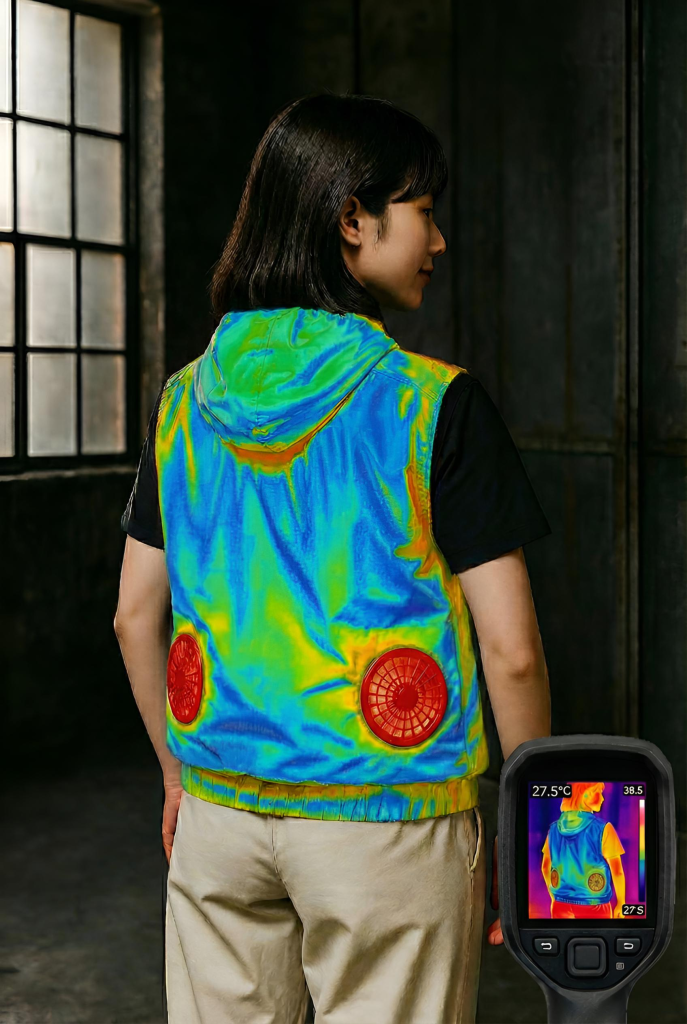 數據不說謊,效果看得見。 透過專業熱成像儀實測,在炎熱環境下穿戴裝備後,背部核心區域(藍色/綠色區塊)溫度顯著低於周圍環境與人體其他部位。雙風扇強力運作,在後背形成廣闊的低溫舒適區,有效防止中暑,提升高溫環境下的作業效率與舒適度。
